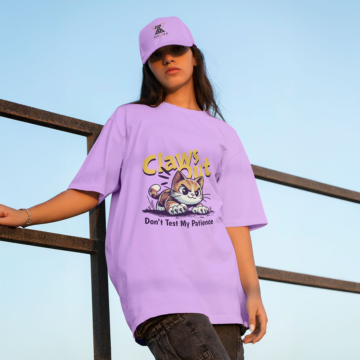 Fierce, funny, and unbothered, this printed oversized tee features an angry cat with the words “Claws Out – Don’t Test My Patience.” It’s soft, roomy, and made to add a playful edge to your everyday wardrobe.