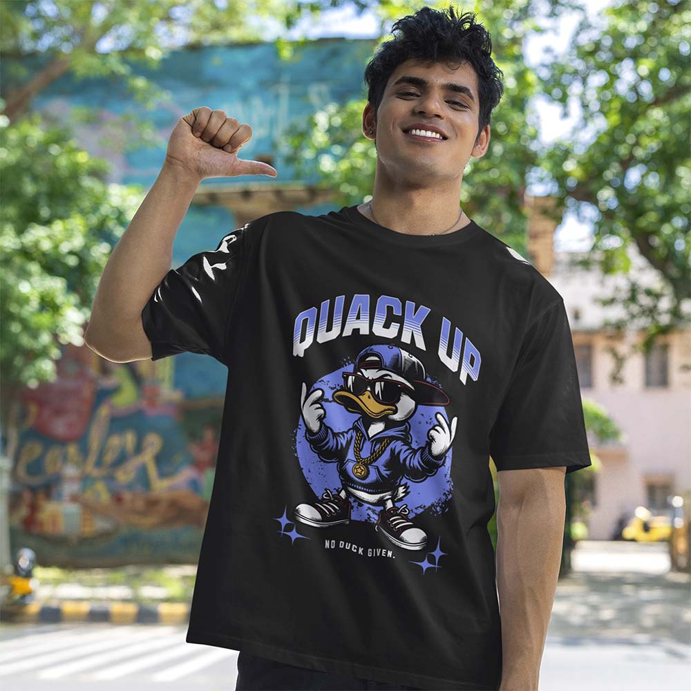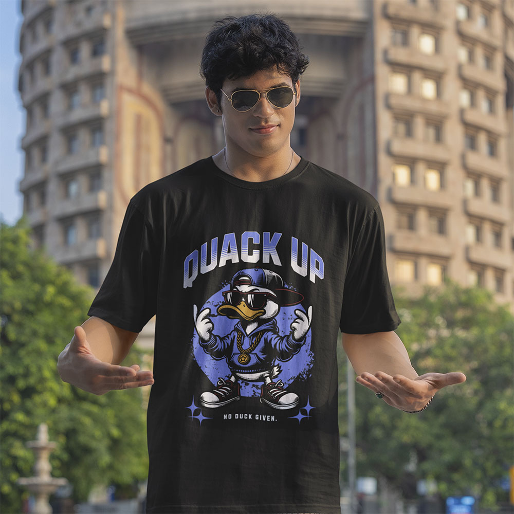 Streetwear attitude, feathered edition. This Quack Up printed oversized cotton t-shirt drops humor and rebellion in one graphic—starring a hip-hop duck in shades, gold chain, and the line “No Duck Given.” Built on a roomy oversized cotton base, it’s bold, playful, and unapologetically loud. Perfect for street fits that don’t care what anyone thinks.