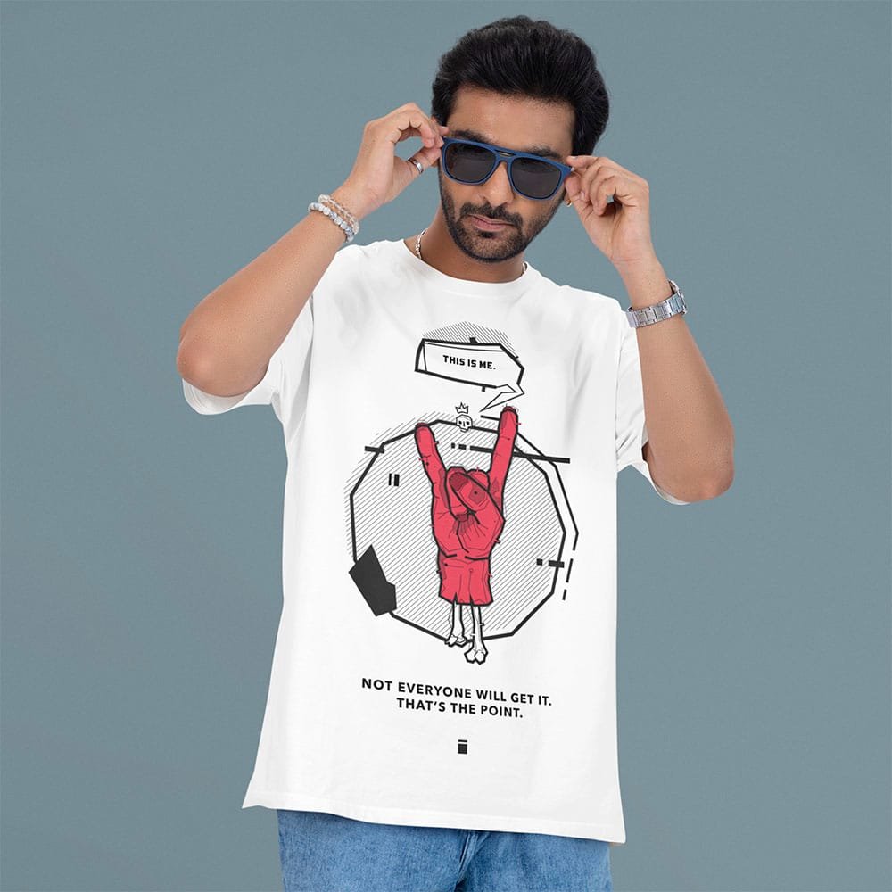 The Urban Rebel oversized t-shirt features a striking red hand gesture layered over a dark abstract backdrop, crowned with a subtle skull detail. The design blends street energy with raw attitude, making it a standout piece for those who refuse to blend in.