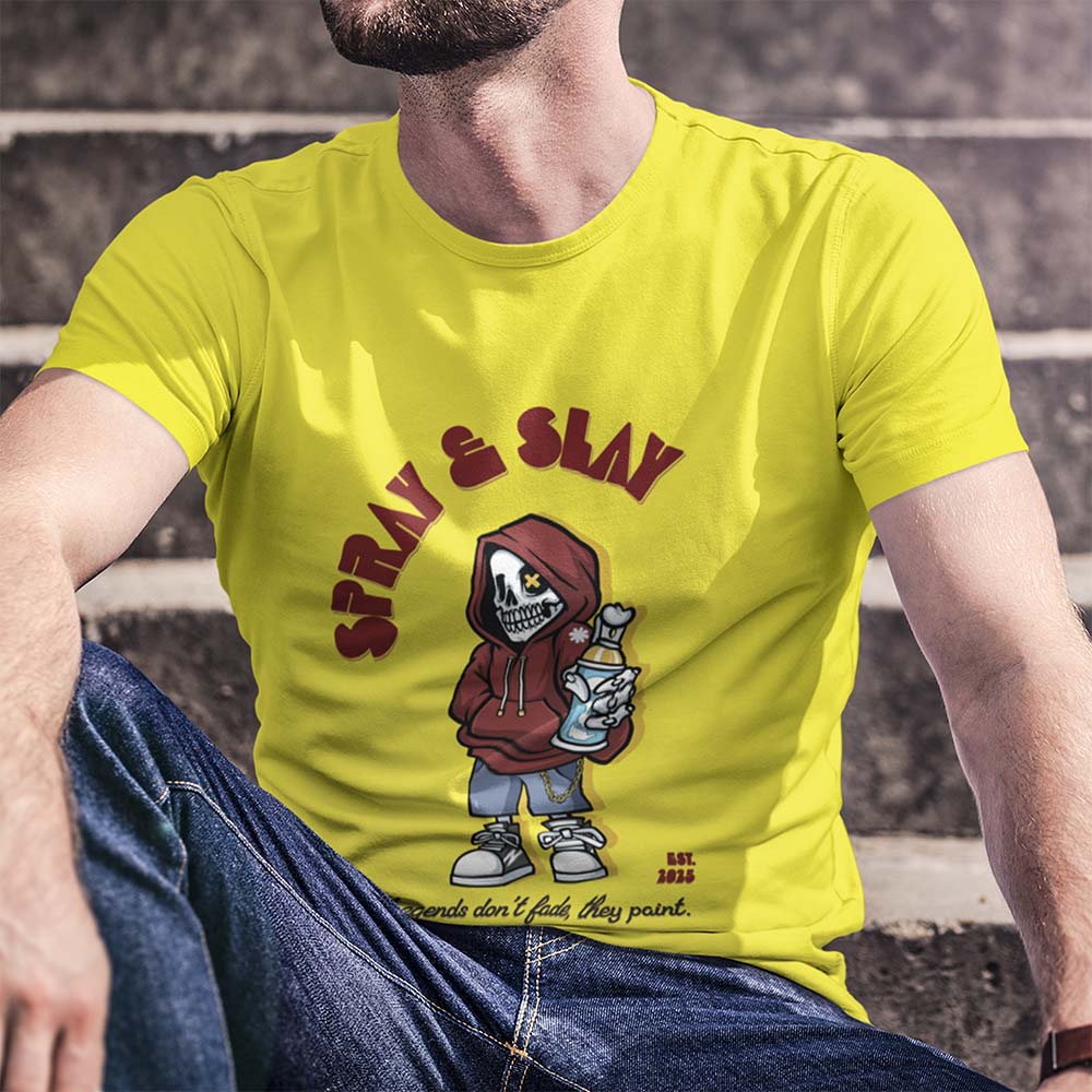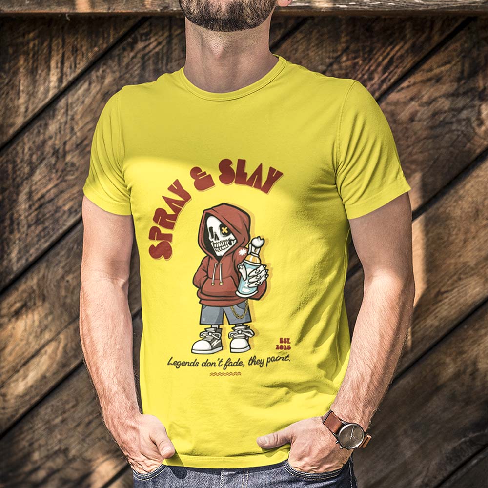 Street art, meet streetwear. This Spray & Slay printed t-shirt features a skeleton-in-hoodie graphic armed with a spray can and the punchline “Legends don’t fade—they paint.” Built for guys who live loud and express themselves without filters, this regular-fit tee pairs best with cargos, ripped denim, or layered under a bomber jacket. A bold nod to rebellion, art, and legacy.