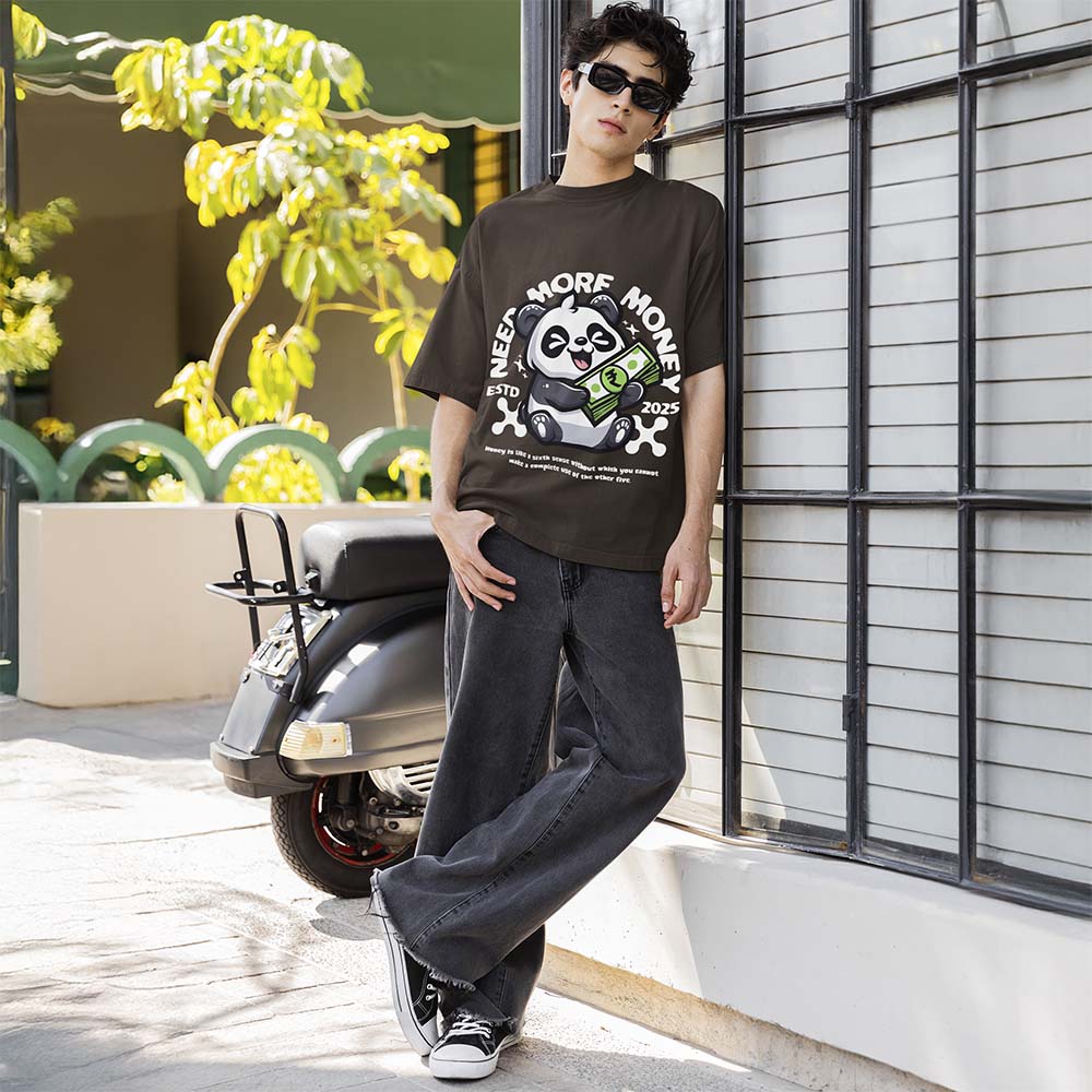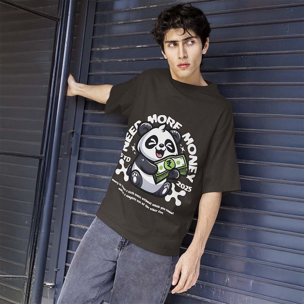 Money talks, so does this panda. This printed oversized tee features a cheeky panda graphic clutching bills with the words “Need More Money.” It’s playful, oversized comfort for those who like their streetwear with humor and hustle.