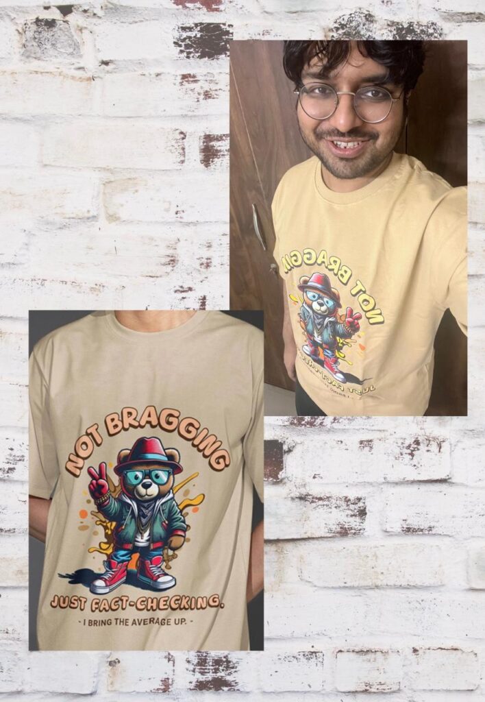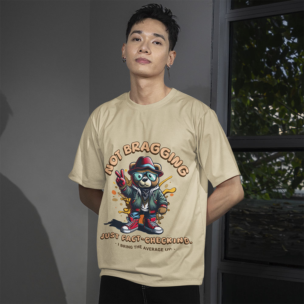 Facts only. This printed oversized tee features a street-ready bear with the line “Not Bragging, Just Fact-Checking – I Bring the Average Up.” Bold print, soft oversized cotton, and a fit that matches its confidence.