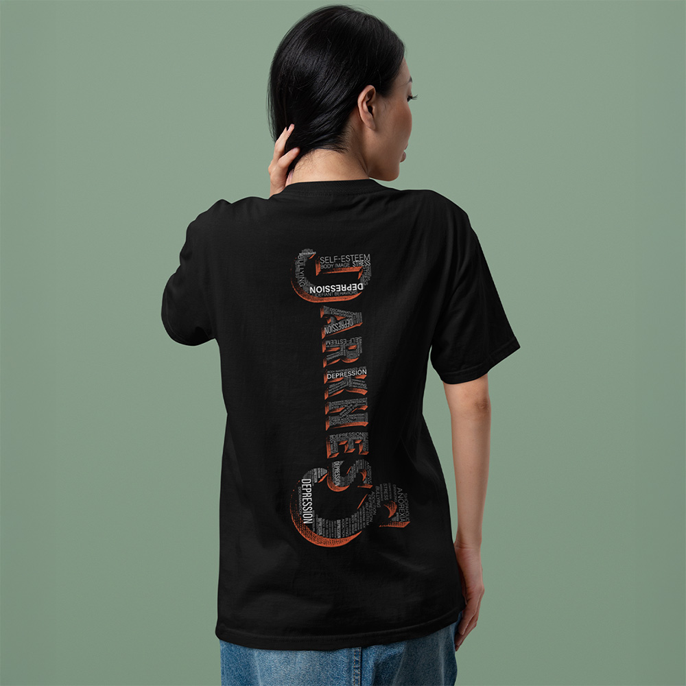 A statement of strength in softness. This Darkness printed oversized t-shirt blends art and awareness—its powerful word cloud forms the shape of darkness itself, built from words like depression, peer pressure, and self-doubt. A quiet reminder that what surrounds you doesn’t define you. Minimal VIRA branding on the front keeps it sleek, while the bold back graphic redefines resilience. Style it loose over jeans or tucked into cargos—confidence never needed color.