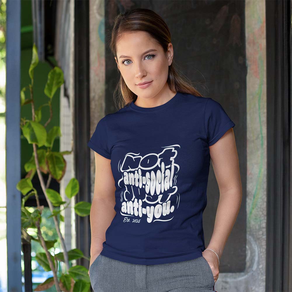 Keep it chic and savage with this Not Anti-Social, Just Anti-You printed t-shirt—perfect for women who own their space and their sass. With its playful retro typography, this tee looks just as good styled with denim shorts as it does with oversized blazers for a street-chic vibe. The ultimate blend of sarcasm and fashion.